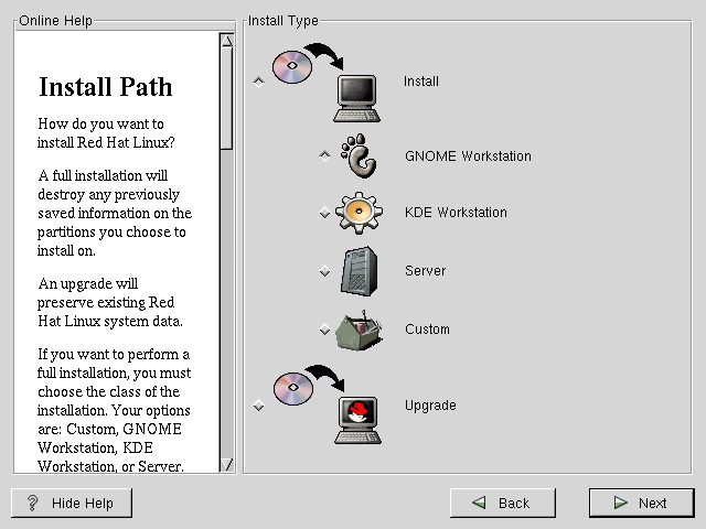 If you choose to perform a full installation, you must also choose the class of the installation. Your options include: Custom, GNOME Workstation, KDE Workstation, or Server.