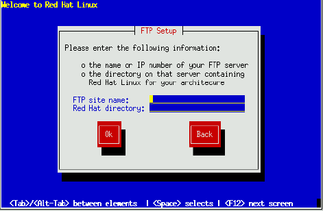 Enter the fully-qualified domain name or IP address of the FTP site you are installing from, and the name of the directory there which contains the RedHat installation files for your architecture. For example, if the FTP site contains the directory /pub/mirrors/redhat/i386/RedHat, enter /pub/mirrors/redhat/i386.