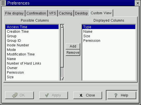 The Possible Columns list includes all of the information types that can be displayed. If you would like to include one, you may press the Add button and it will be added to the Displayed Columns list.